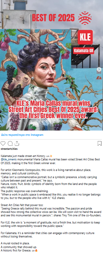 Η Καλαμάτα περνά στην παγκόσμια ιστορία της street art, καθώς η τοιχογραφία της Μαρίας Κάλλας στην Αριστομένους, έργο του Κλεομένη Κωστόπουλου (KLE), αναδείχθηκε καλύτερο γκράφιτι στον κόσμο για το 2025 από το Street Art Cities