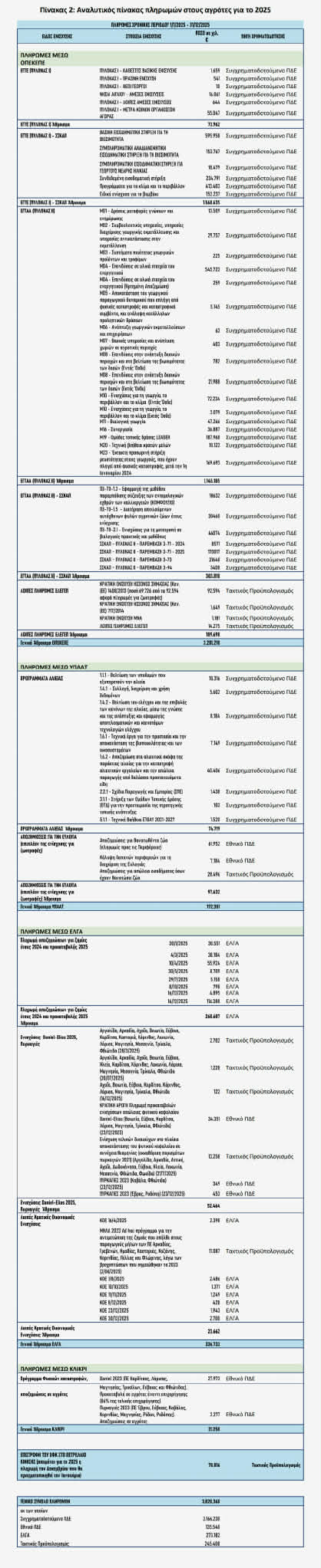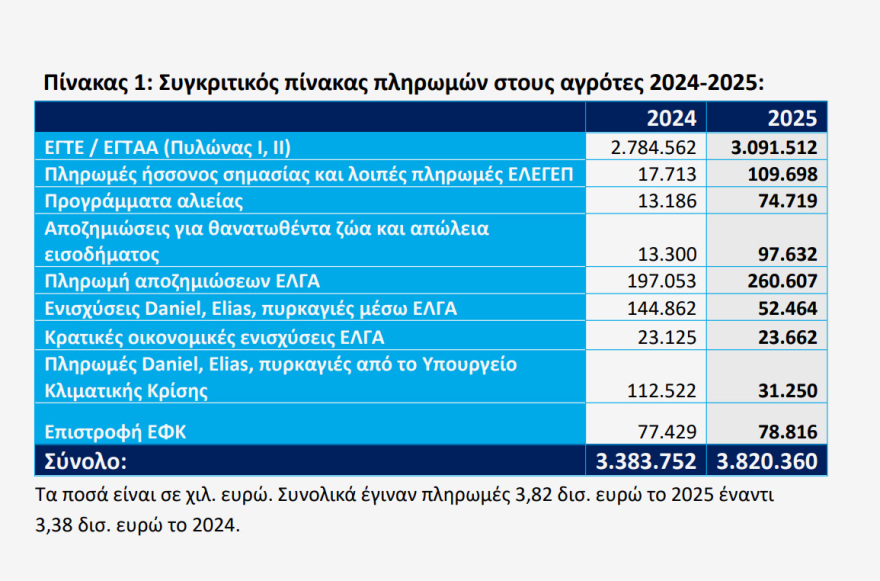 «3,82 δισ. ευρώ καταβλήθηκαν στους αγρότες μας το 2025 από τον ΟΠΕΚΕΠΕ, το Υπουργείο Οικονομικών και τον ΕΛΓΑ. Το ποσό αυτό είναι το μεγαλύτερο των τελευταίων ετών και κατά 13% πιο μεγάλο από τα 3,38 δισ. ευρώ που καταβλήθηκαν το 2024.