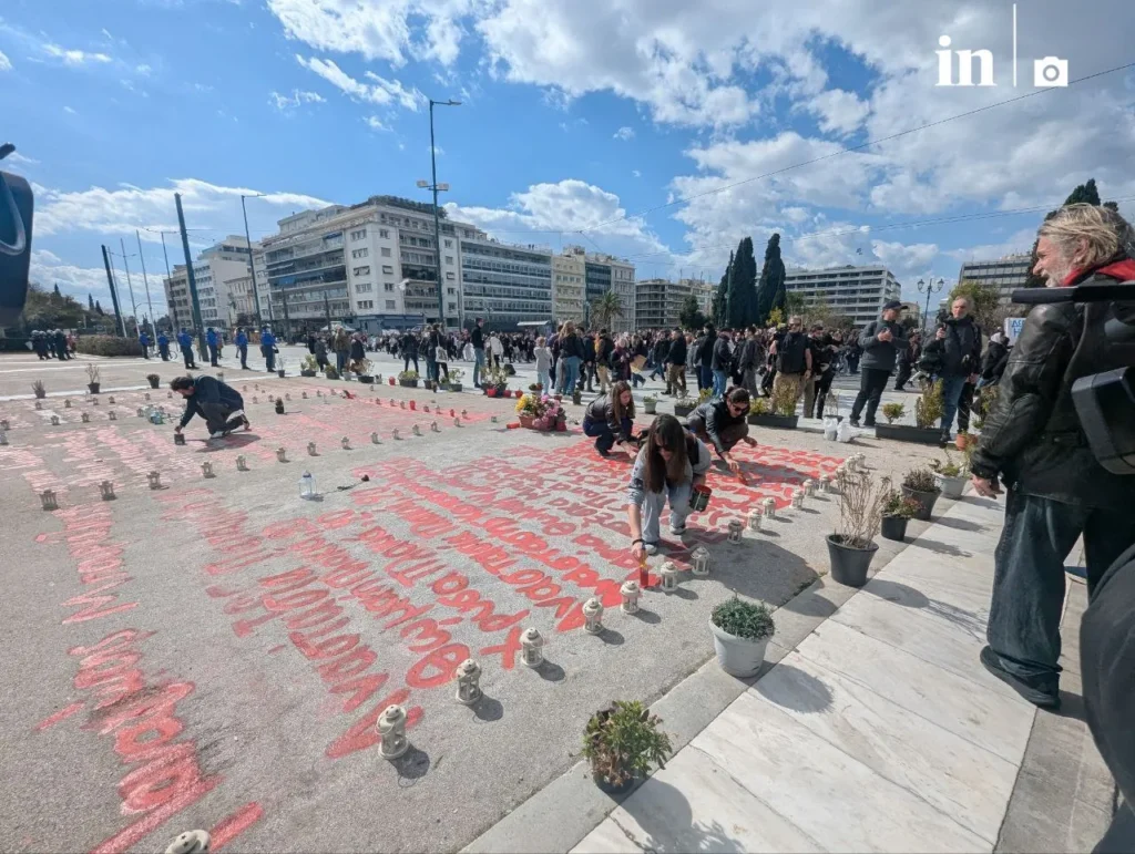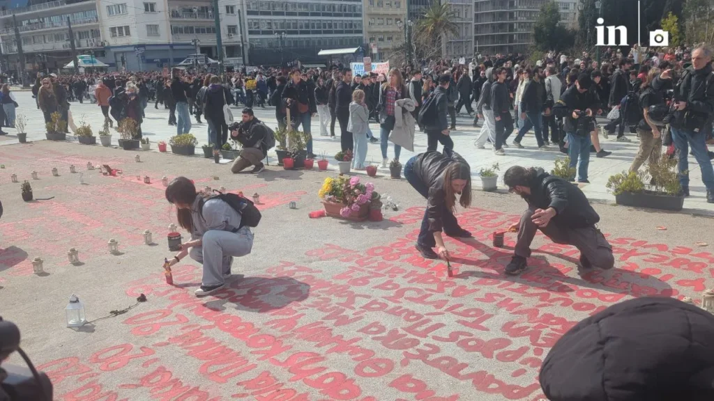 Η πορεία ξεκίνησε από τα Προπύλαια και έφτασε στο Σύνταγμα όπου διαδηλωτές έγραψαν τα ονόματα των 57 θυμάτων.
